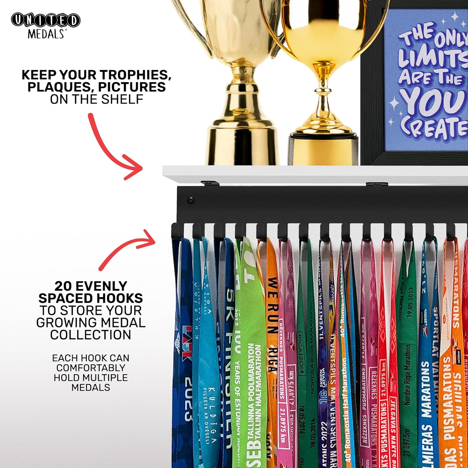 United Medals medal display hanger is the best place for your race medals and competition awards!