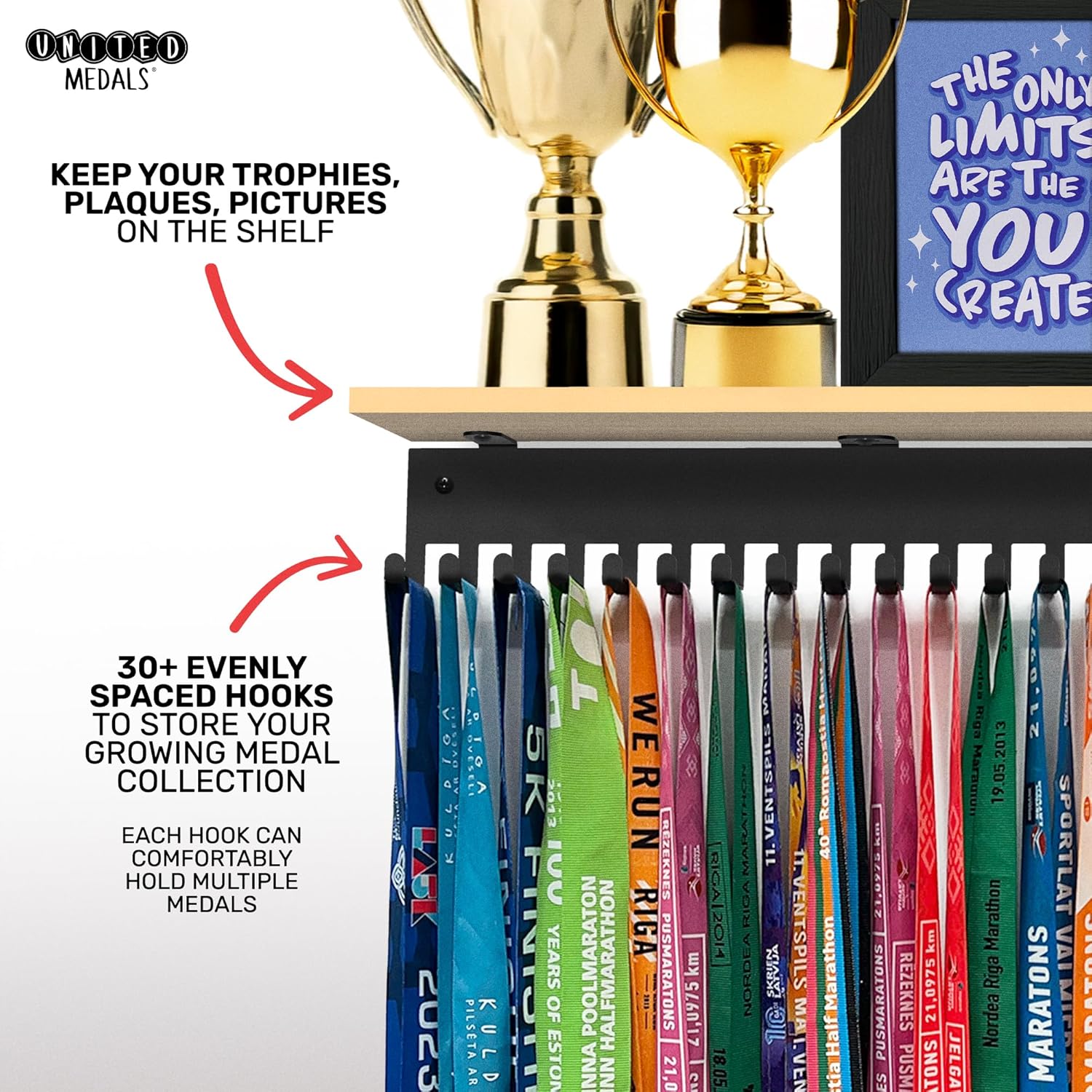 United Medals medal display hanger is the best place for your race medals and competition awards!
